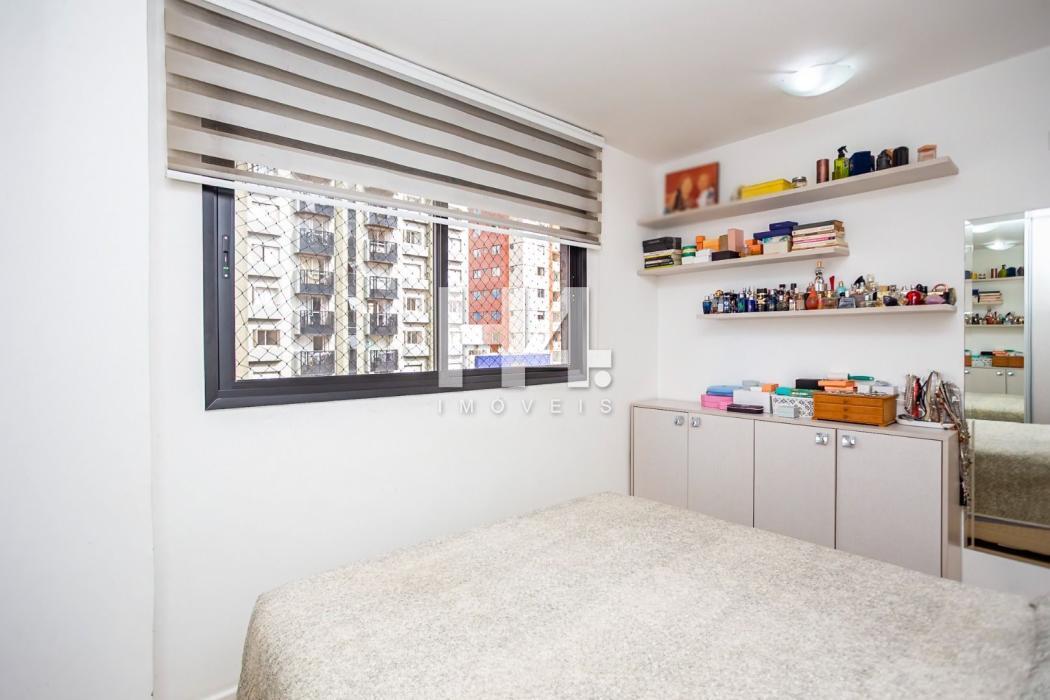 - Quarto casal com cortina, espelho, cabeceira, armário, prateleiras e sapateira;
