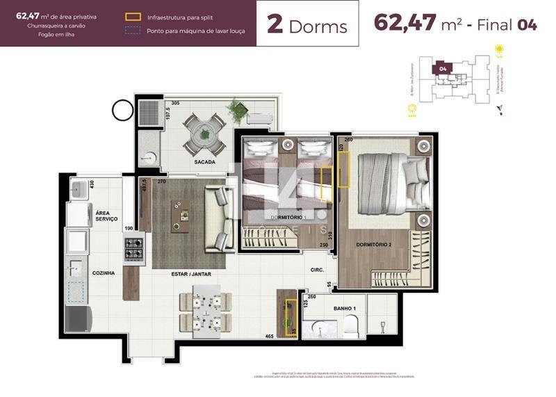 São 2 quartos com armários planejados, sala para dois ambientes; estar e jantar, com porta-janelão que integra a varanda, além de cozinha equipada com armários, cooktop, forno e área de serviço funcional. O imóvel conta ainda com 1 banheiro e 1 vaga de garagem.