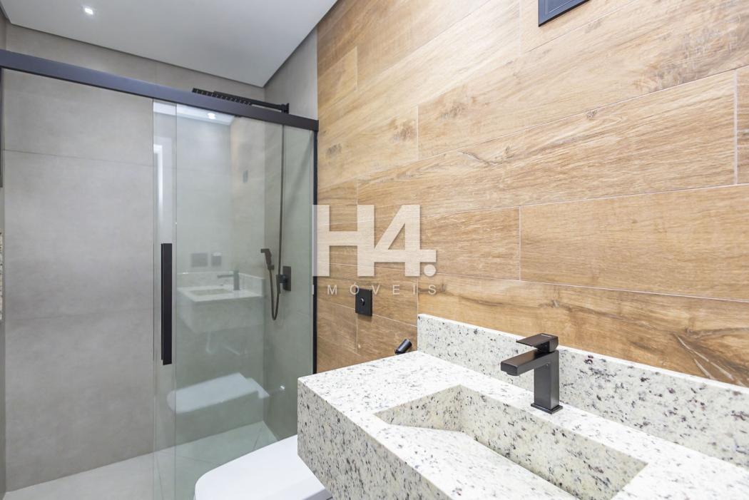 - Banheiro suíte com pia esculpida em mármore, piso aquecido, ducha higiênica, banco de sauna com led, box e metais instalados