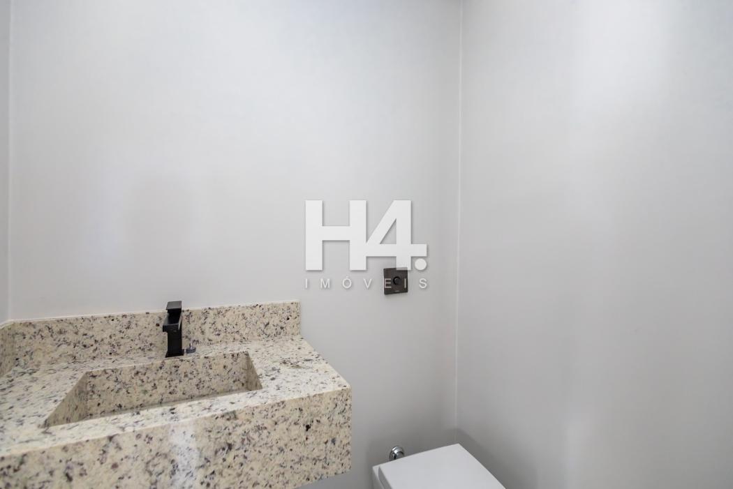 - Banheiro social com pia esculpida em mármore, louça moderna, piso aquecido, ducha higiênica, box e metais instalados