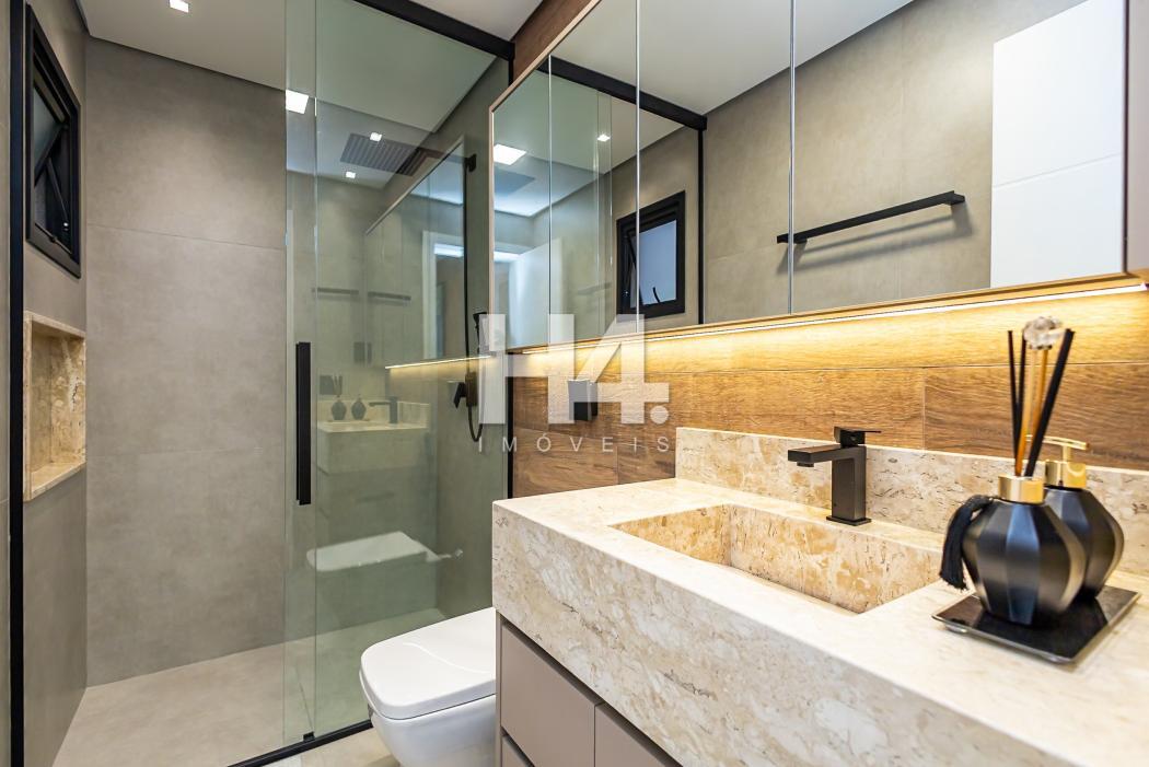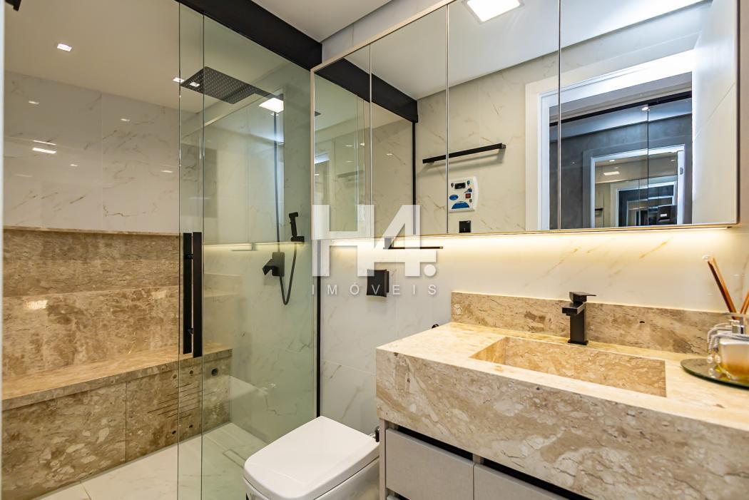 - Banheiro suíte com pia esculpida em mármore, piso aquecido, ducha higiênica, banco de sauna com led, box e metais instalados