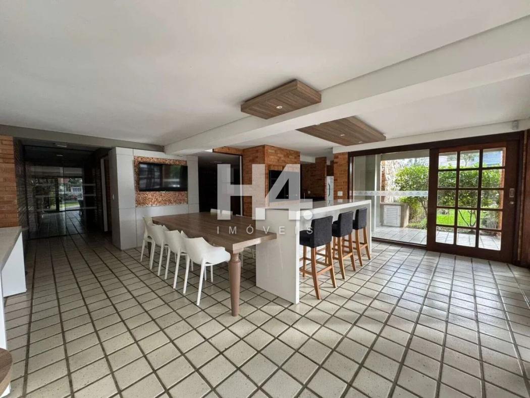 Na área social, a integração entre cozinha, sala de jantar e espaço gourmet com churrasqueira cria um ambiente moderno, funcional e acolhedor. O living amplo, ideal para estar ou home theater, também possui infraestrutura para ar-condicionado.