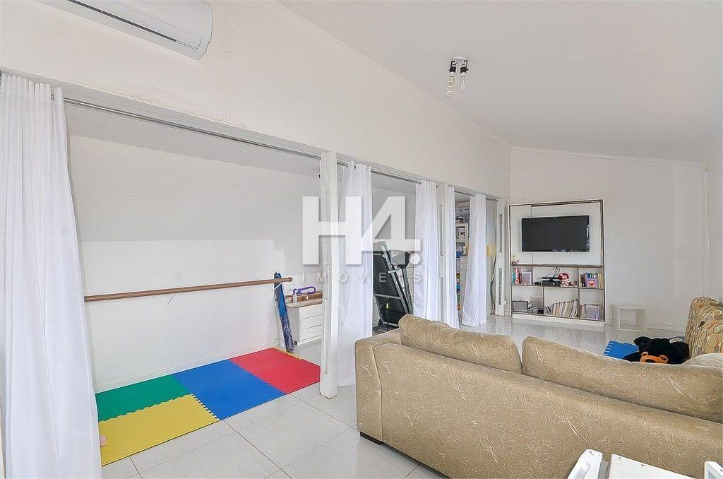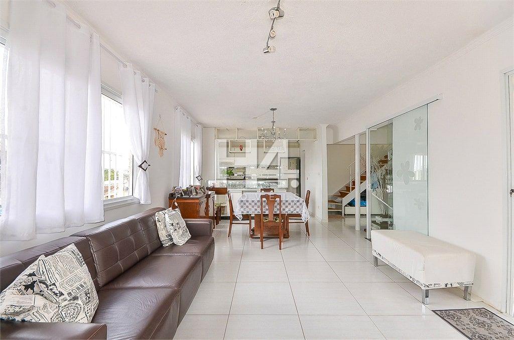 No primeiro andar o imóvel possui 150m² de área construída, churrasqueira, sala e cozinha no conceito aberto, área de serviço/lavanderia, quatro quartos, sendo uma suíte, três quartos possuem closet e atualmente um dos quartos está sendo usado como escritório.