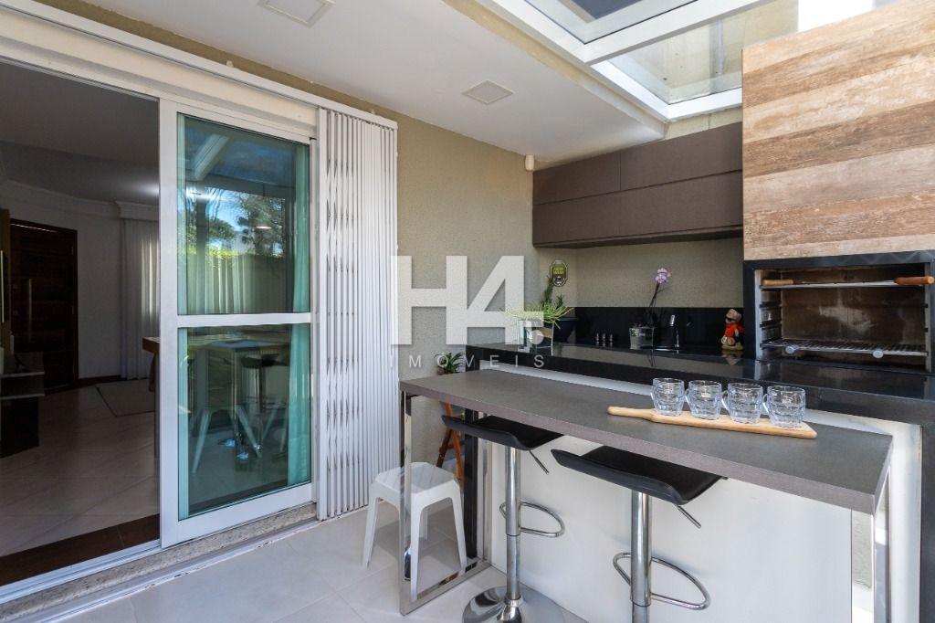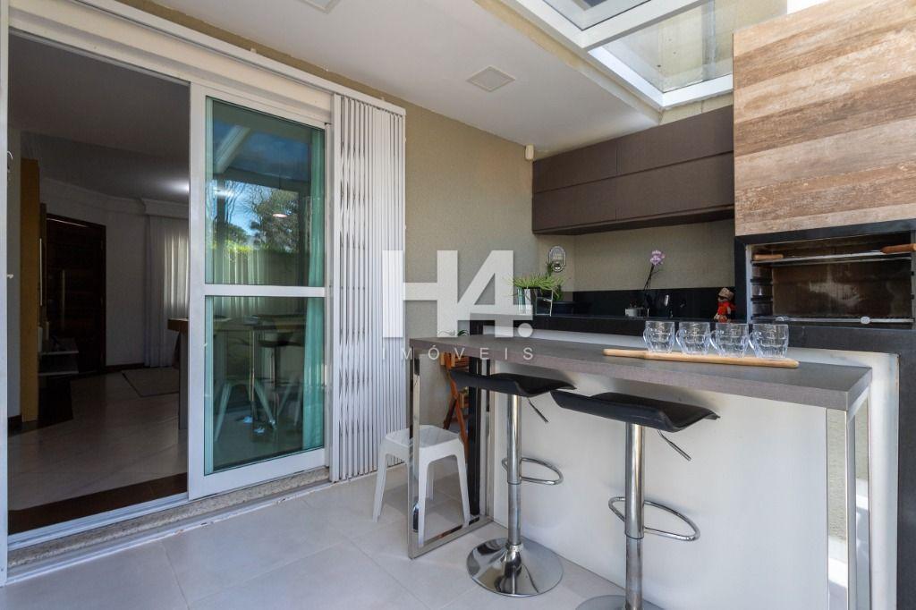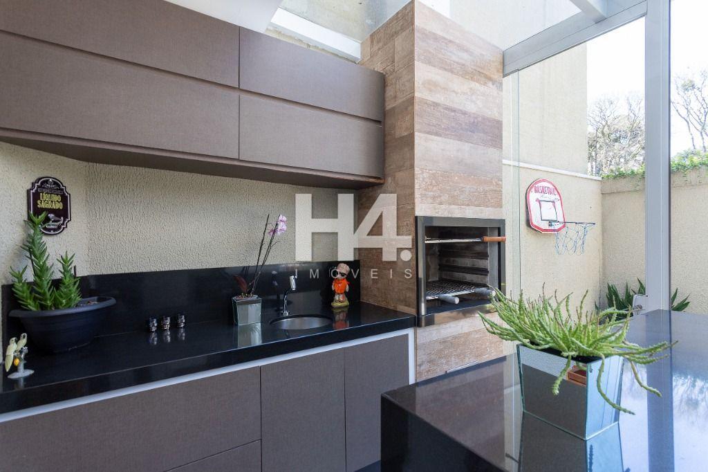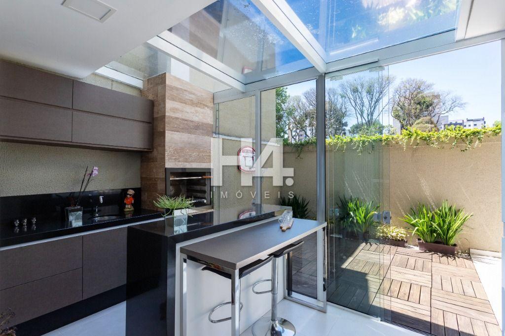 Espaço gourmet envidraçado, equipado com churrasqueira revestida, bancada em granito e armários planejados ideal para momentos de lazer;