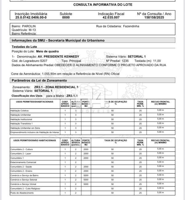 Terreno plano, meio de quadra, com ampla testada de 22 metros, localizado na Av. Presidente Kennedy, nº 1225/1235 Rebouças. São 2 matrículas